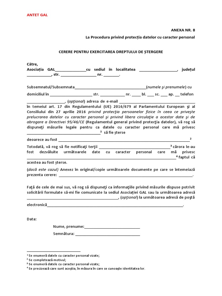 Model Cerere ștergere Date Cu Caracter Personal Docx
