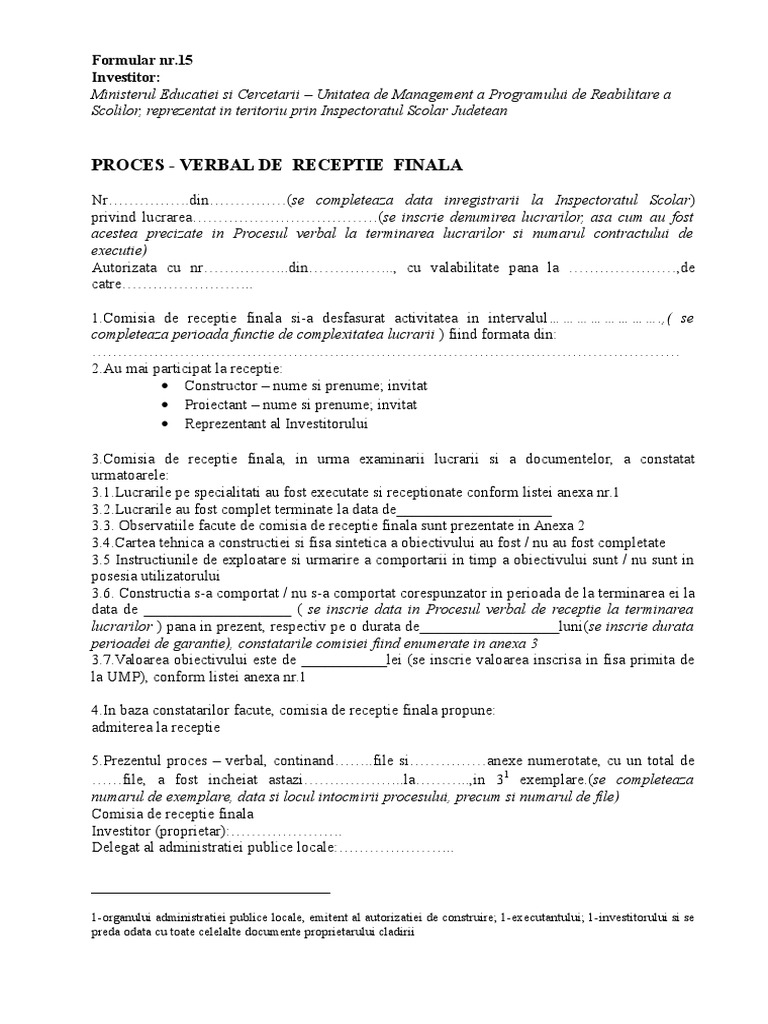 Formular Nr 15 Proces Verbal De Receptie Finala